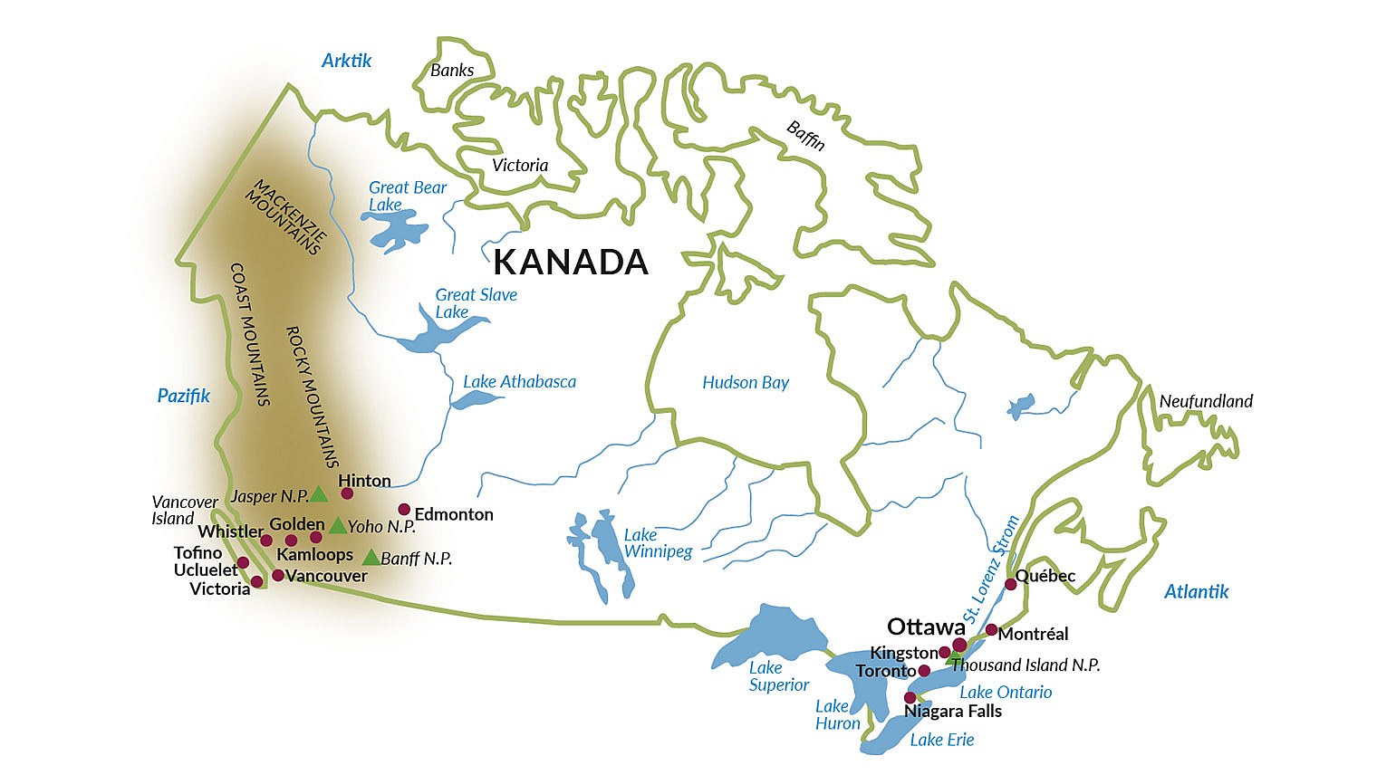 Entdecken Sie Kanada – ein Land voller Wunder! Spüren Sie französisches Savoir-vivre in Montréal und Québec, schlendern Sie durch Ottawa und genießen Sie die Ruhe der Thousand Islands. Lassen Sie sich an den rauschenden Niagara-Fällen in Staunen versetzen, bevor Sie in die majestätischen Rocky Mountains reisen: glitzernde Seen im Jasper Nationalpark, schroffe Gipfel in Banff und wilde Schönheit im Yoho Nationalpark. In Kamloops kosten Sie edle Weine und auf Vancouver Island erwarten Sie endlose Strände, imposante Zedern im Regenwald sowie die stille Magie von Cathedral Cove. Vancouver – das Juwel der Westküste – krönt die Reise.