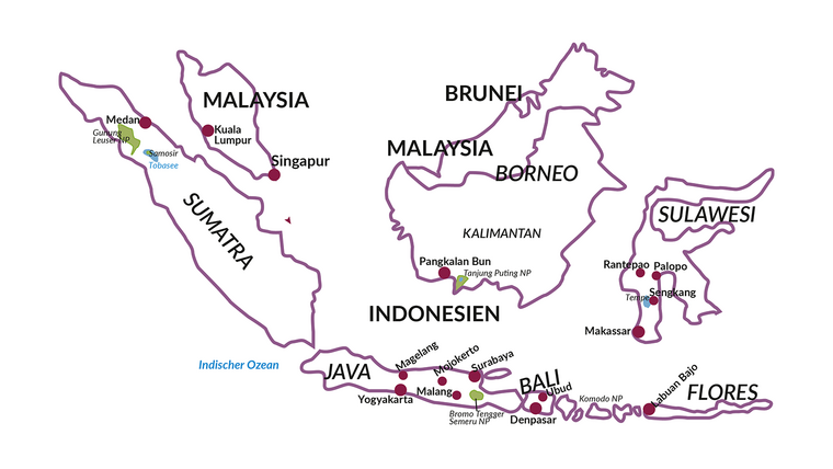 Mit Indonesien entdecken Sie einige der faszinierendsten Inseln Südostasiens! Statten Sie den Affen im Dschungel von Sumatra einen Besuch ab, spazieren Sie auf Java durch den Königspalast von Yogyakarta und erleben Sie traditionelle Handwerkskunst hautnah. Eine Bootstour mit Übernachtung im Komodo Nationalpark bringt Sie zu rosa Stränden und den einzigartigen Komodowaranen. Von der Kultur der Batak am Tobasee bis zu hinduistischen Ritualen auf Bali, von Vulkanen bis zu farbenfrohen Korallenriffen – Indonesien ist ein Land, das begeistert!